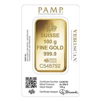 Description: 100 gram 999.9 purity gold bar.
